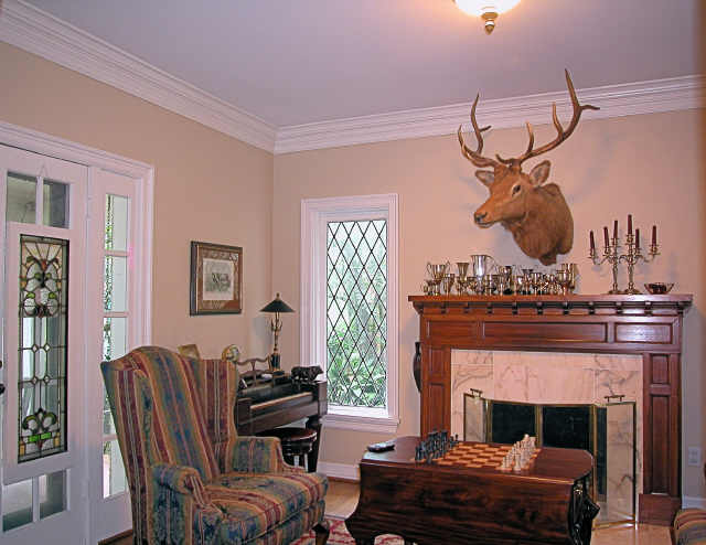 2013: Contemporary furniture was mixed with antique chairs. The fireplace mantel was painted white and the white marble was removed and replaced with black honed granite. They did leave the original leaded glass windows, which is so nice.